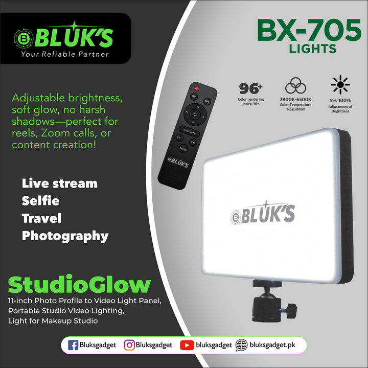 The BX-705 StudioGlow by BLUK'S is engineered for creators and professionals. Enjoy soft, adjustable lighting for makeup, photography, video production, or live streaming—anytime, anywhere